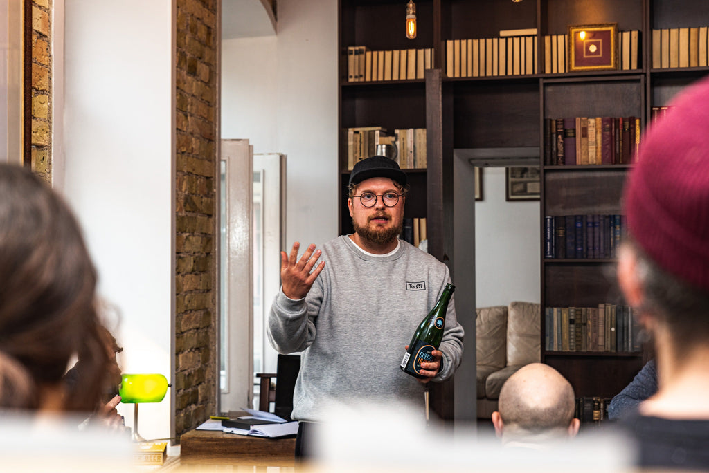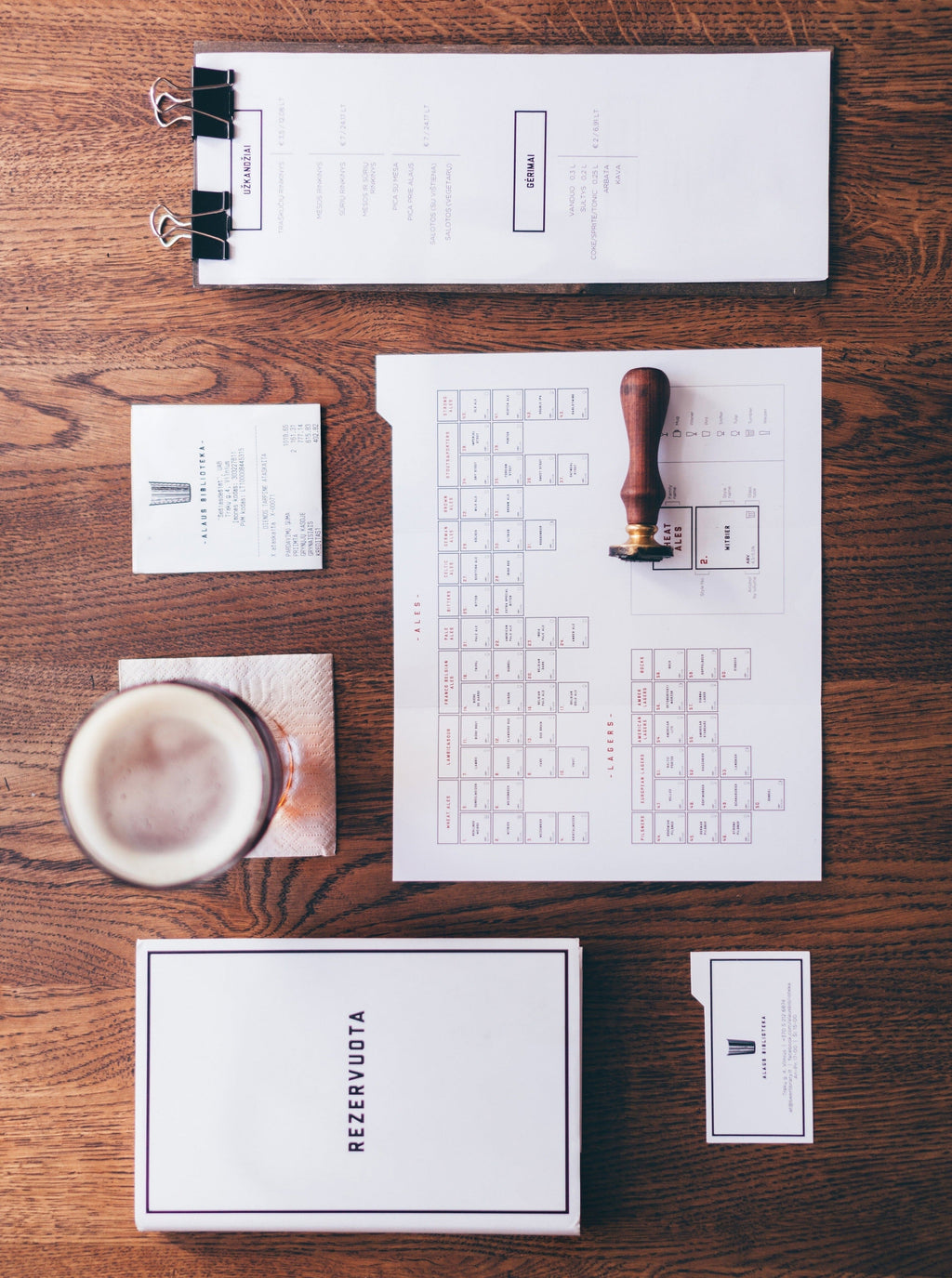 • Gyvą degustaciją bare Alaus Biblioteka sėdint prie staliuko.